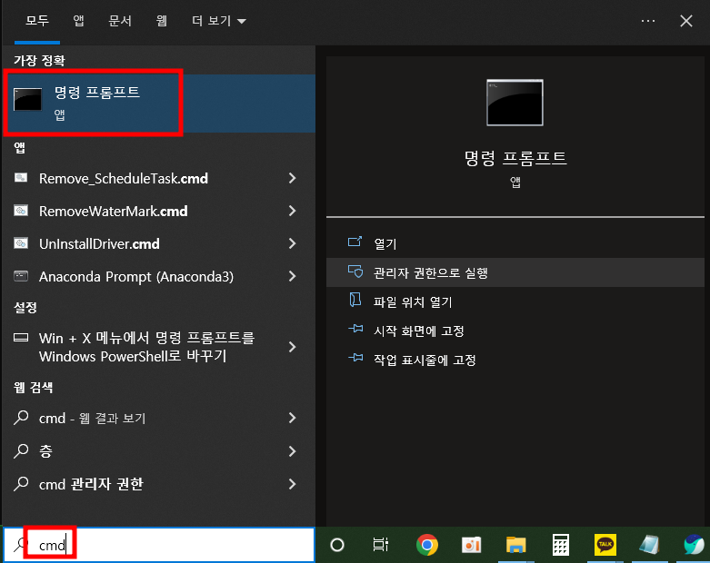 잘 설치가 되었는지 확인을 위해 윈도우 검색창에 CMD 를 입역합니다. 그러면 명령 프롬프트 창이나옵니다.